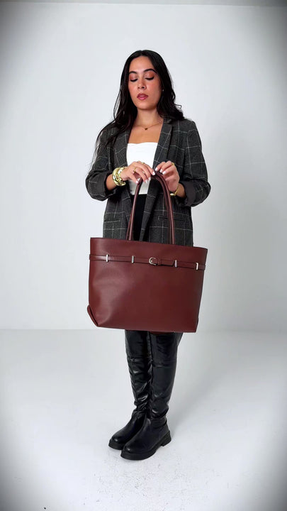 A timeless tote that combines functionality with refined elegance. This black silhouette features a distinctive belt detail at the center, adding architectural interest to its structured design. Crafted for everyday versatility, it accommodates essentials with ease while maintaining a polished aesthetic. The classic colorway pairs seamlessly with any wardrobe, making it an indispensable accessory for professionals and style-conscious individuals alike.